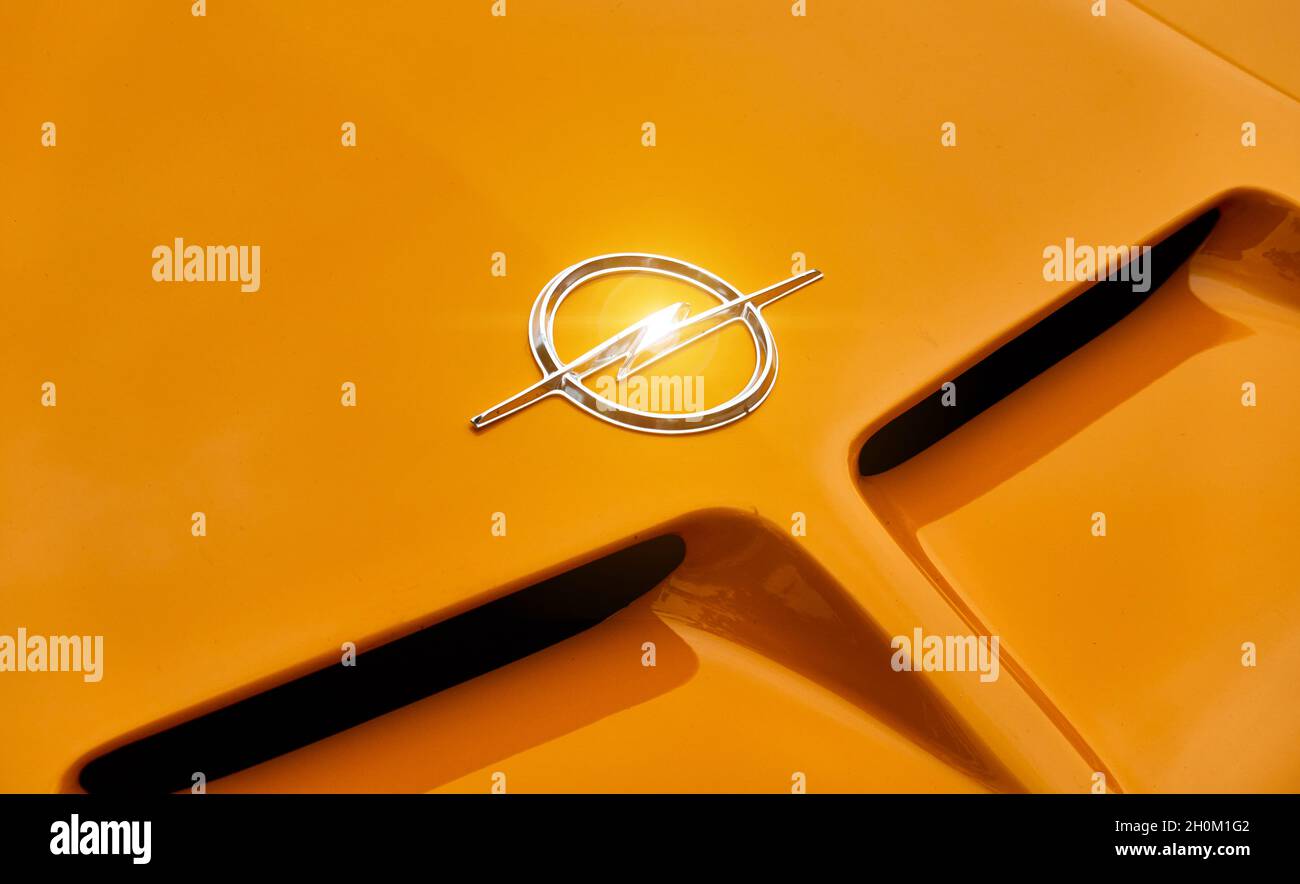Opel Logo Made Of A Stylized Silver Lightning Bolt In A Circle On The Hood Of An Orange Opel Gt Sports Car In Lehnin Germany September 12 2021 Stock Photo Alamy